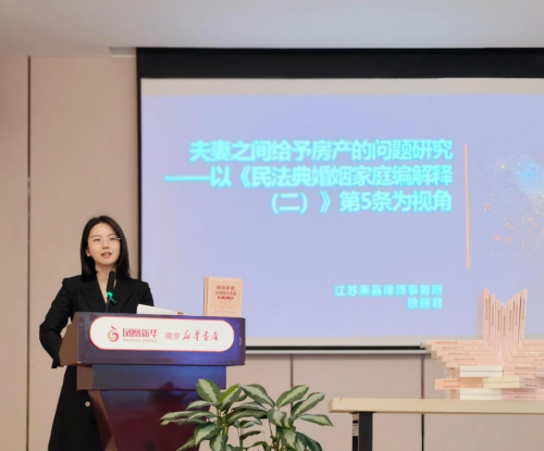 该书副主编、江苏禾嘉律师事务所婚姻家庭业务部主任、国家二级心理咨询师徐丽君就该书特色进行了简要介绍,并结合全书内容,就“夫妻之间给予房产相关法律问题”作了发言。