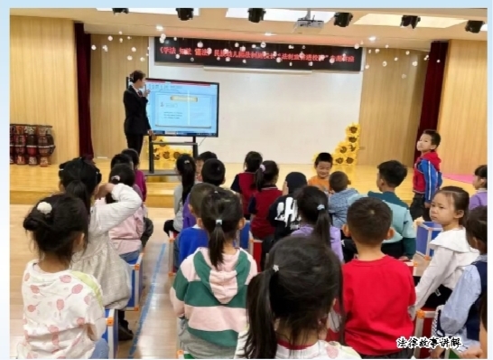 在讲座中,法治副校长将法律知识与儿童理解的故事相结合,深入浅出地让孩子们懂得了“每个人都应该知法守法,做一个遵纪守法的公民”。(李海兰 摄)