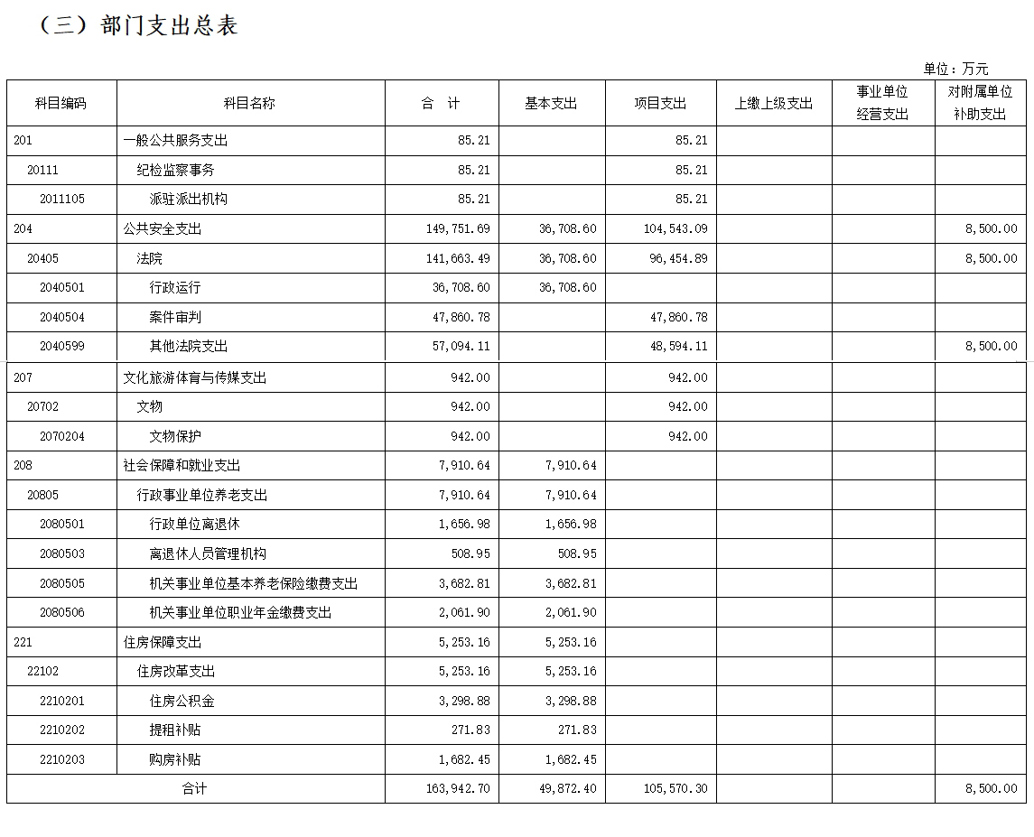 最高人民法院本级2025年收支总预算为163,942.70万元。按照综合预算的原则,最高人民法院本级所有收入和支出均纳入部门预算管理。收入包括:一般公共预算拨款收入、附属单位上缴收入、上年结转等;支出包括:一般公共服务支出、公共安全支出、文化旅游体育与传媒支出、社会保障和就业支出、住房保障支出等。