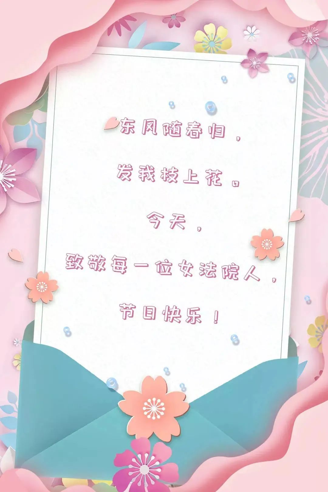 三月的暖阳,为笑容增添光彩;三月的清风,吹开美丽的心情;三月的花朵,传递声声祝福。在三八节来临之际,祝法院的女干警们:青春永驻快乐无数,事业顺心家庭美满,身体健康万事顺遂。
