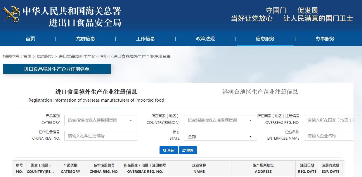 海关总署对向中国境内出口食品的境外生产企业实施注册管理,并公布获得注册的企业名单。