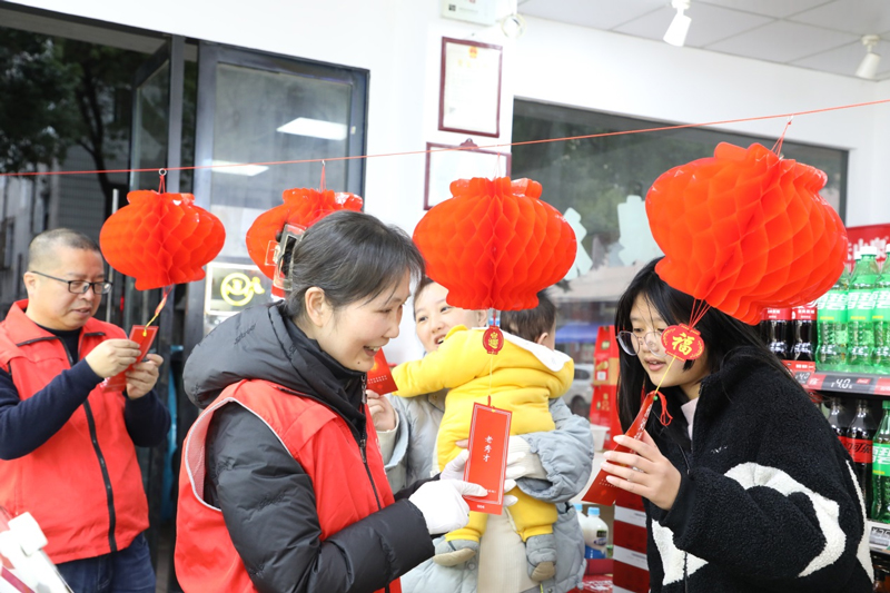 在“律动”普法志愿者的精心布置下,台州一零售户王莉军店里的灯笼高高挂起,彩色的灯谜卡片轻摇摆动,满满的节日感引来了周边群众的驻足围观。
