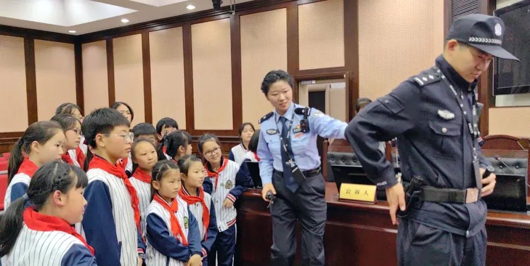 在余姚法院十八号法庭,讲解员向同学们详细介绍了司法警察在刑事案件审理过程中所承担的工作任务,包括押解、看管被告人或罪犯,传带证人、鉴定人或其他诉讼参与人,传递展示证据,维护法庭秩序,预防、制止、处置妨害审判执行秩序的行为等。