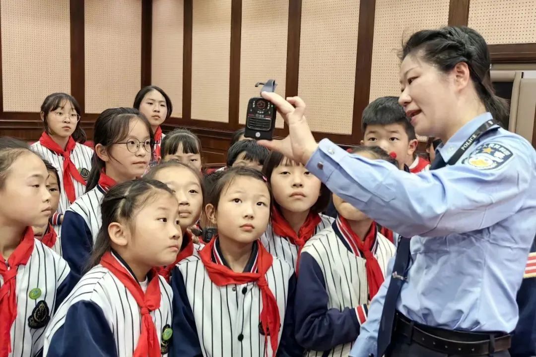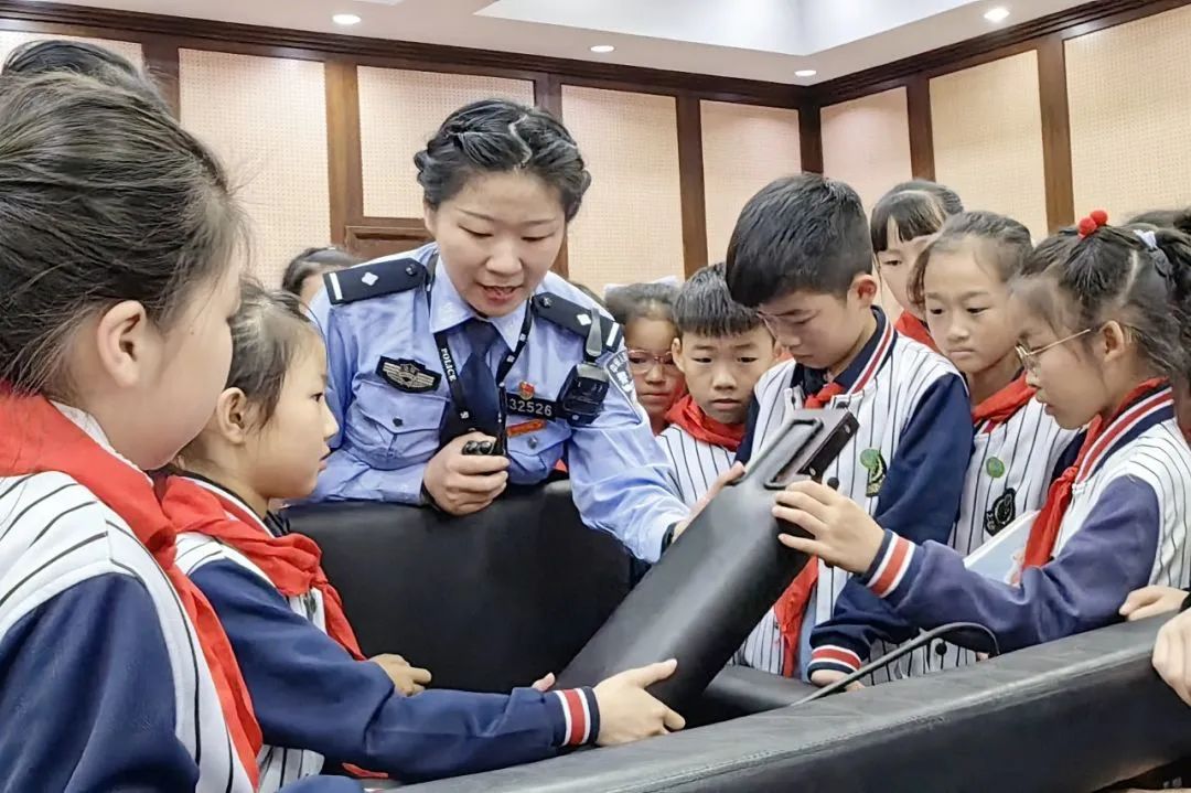 在装备库里,同学们看到了司法警察的日常出警装备,现场体验了警棍、盾牌、手铐等警用器材的使用方法。面对新奇的警用装备,萌娃们纷纷“发问”,讲解员耐心解答了孩子们的提问。