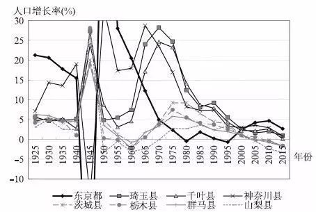 图2日本首都圈内各都县五年期人口增长率变化(1920—2015年)