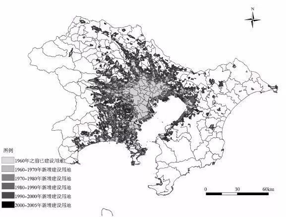 在人口结构变化的同时,土地利用结构也发生变化(图3)。东京都市圈1960、1970年代建设用地数量和空间范围扩张很快。