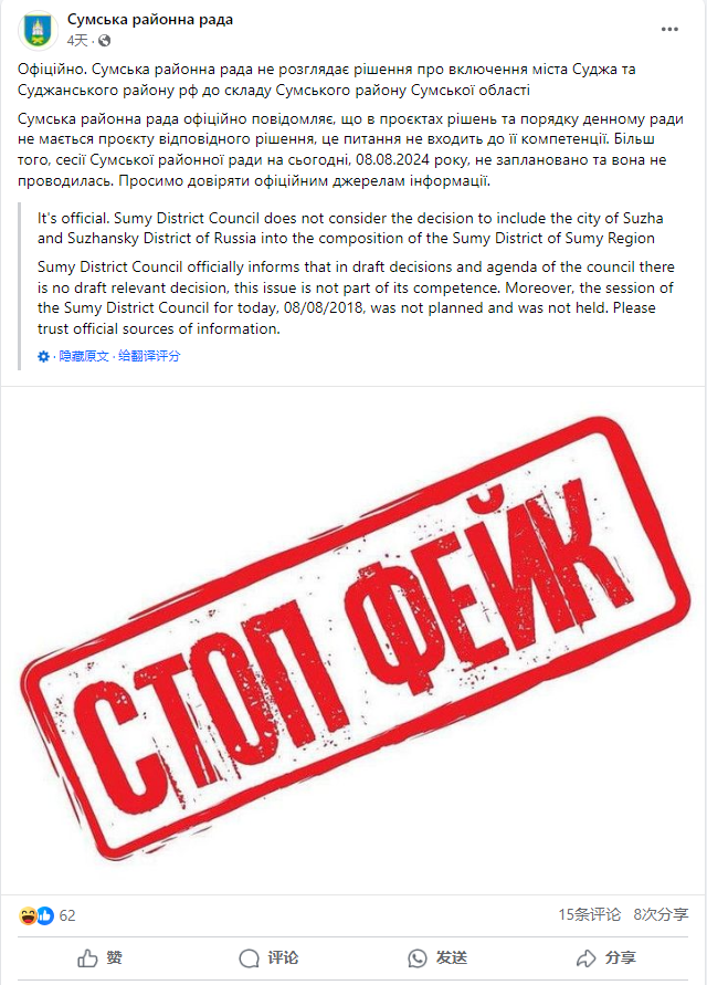 苏梅区议会的官方Facebook账号也在8月8日发布了声明,否认了网传文件的真实性。声明称:“苏梅区议会对将俄罗斯苏贾市和苏贾区划入苏梅州苏梅区的决定不作考虑。苏梅区议会正式公告,该议会的决定草案和议程中没有相关决定草案,此问题不属于其职权范围。此外,今天(2024年8月8日),苏梅区议会没有计划也没有举行会议。”