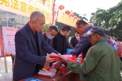 12月4日是第八个国家宪法日。为深入学习宣传宪法,弘扬宪法精神,维护宪法权威,12月8日上午,忻城县利用赶集日在中心文化广场举行2021年宪法宣传活动。