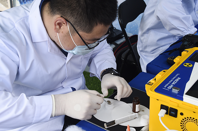 5月11日,现场勘验采样与快速检测环节,参赛检察官、检察技术人员对样品进行检测。