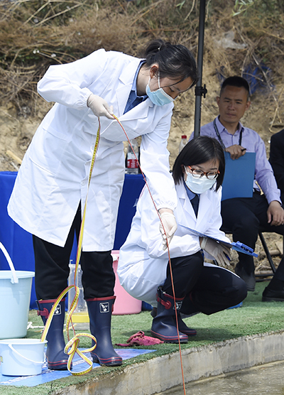 5月11日,现场勘验采样与快速检测环节,参赛检察官、检察技术人员测量水深。