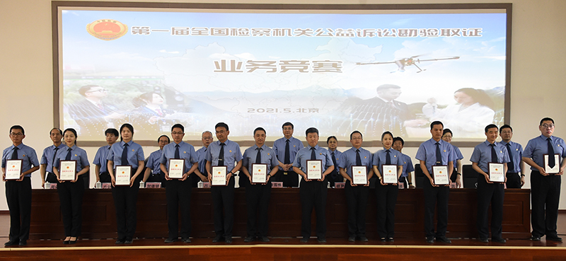 闭幕式上,获得第一届全国检察机关公益诉讼勘验取证业务竞赛“勘验取证标兵”称号的参赛检察官、检察技术人员合影留念。
