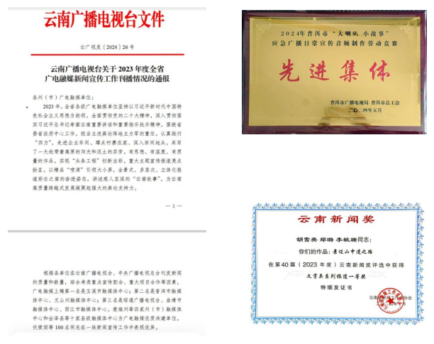 1.普洱市融媒体中心2024年共有55件次作品在云南新闻奖、中国城市党报优秀新闻作品、少数民族地区报业新闻奖、地市报优秀新闻作品等新闻评选中获得一、二、三等奖。其中,云南新闻一等奖作品3件,为普洱新闻史上最多的一年;《“老挝留学生讲中老故事”系列融媒体报道》在城市党报媒体融合优秀作品评选中获国际传播一等奖,这是中心首件作品在国际传播类新闻作品评选中获一等奖。