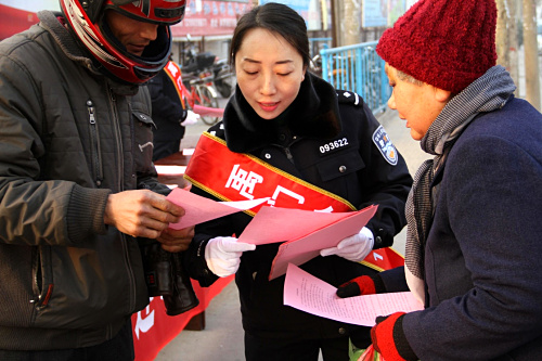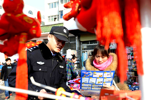 1月10日,在山西长治英雄台小商品百货市场,长治城区公安分局英雄路派出所的民警向群众宣传安全防范知识。新华社发(梁栋 摄)