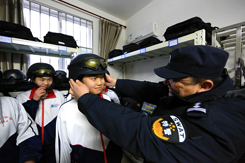 1月10日,天津市中学生试戴防爆头盔,学习安全防范知识。新华社发(杨玉山 摄)