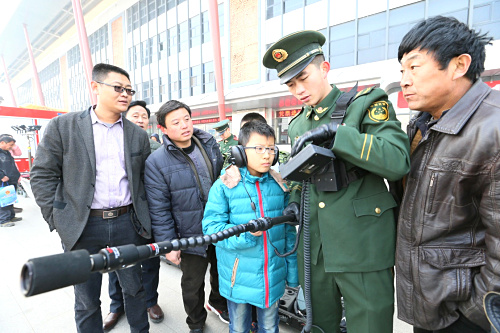 1月10日,山东即墨市公安局消防大队武警战士贾宗智(右二)在为市民演示蛇眼生命探测仪的使用方法。新华社发(梁孝鹏 摄)