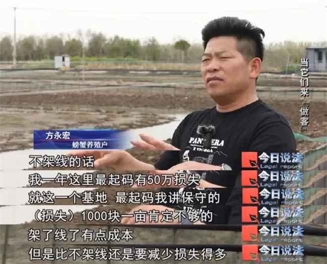 螃蟹养殖户方永宏的露天蟹塘靠近上海崇明东滩鸟类国家级自然保护区,他说,每年候鸟过境时节,崇明岛上的水产养殖户最怕野鸟过来掠食,如果不架线,可能就损失惨重。