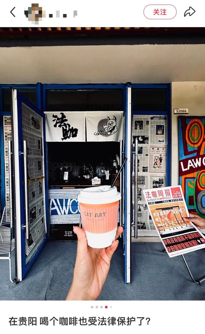 像郑州的庭外咖啡,招牌就标明这是“一家合法的咖啡店”、湛江的“律咖”牌匾上宣称道“一杯律咖解决一个法律问题”、贵阳的“LAW COFFEE”会在门店贴满自制的“法咖周报”等等。
