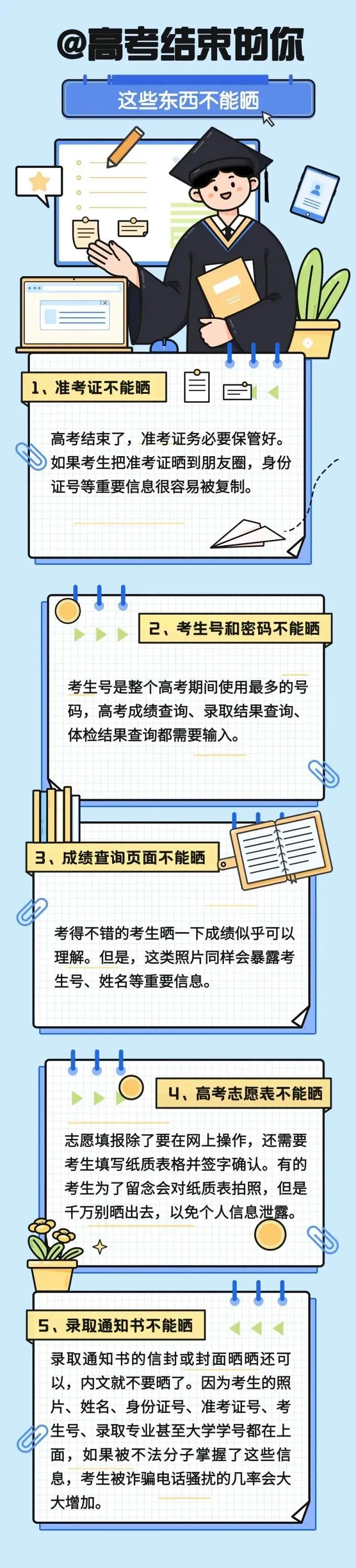 高考后,特别是到了填报志愿和领取录取通知书的阶段,不少喜欢拍照留念的同学激动不已,纷纷发圈晒照与大家一起分享这些令人欣喜和值得纪念的时刻。但是有些东西千万不能晒,一旦泄露的个人信息,被不法分子利用,被诈骗和骚扰的几率也将大大增加!