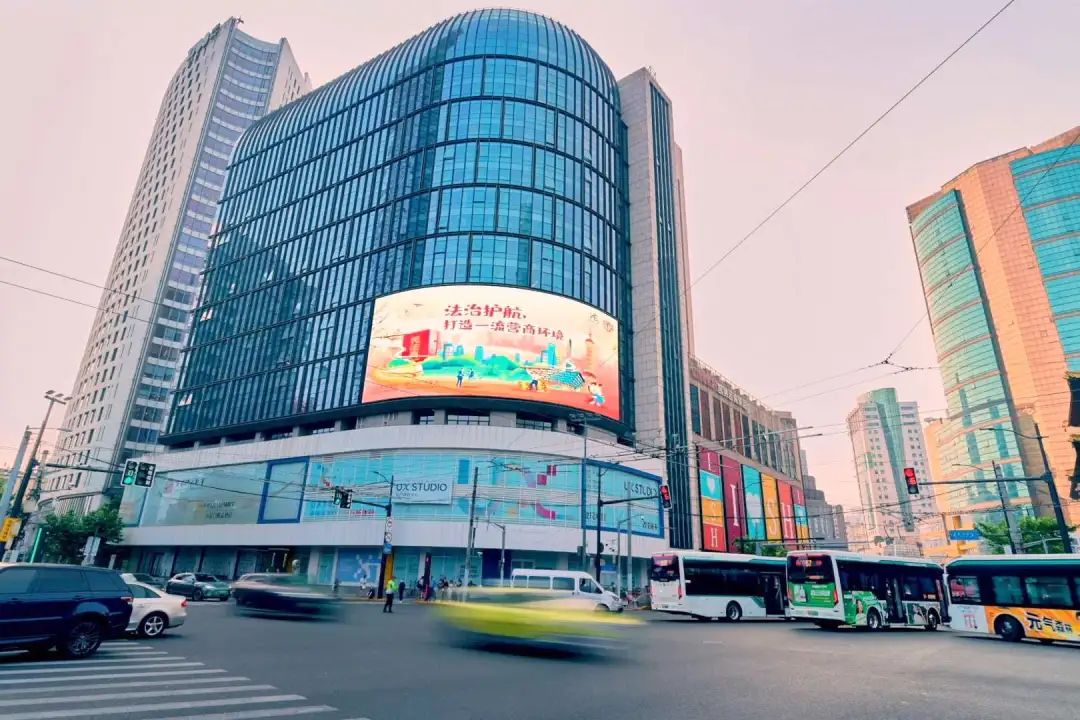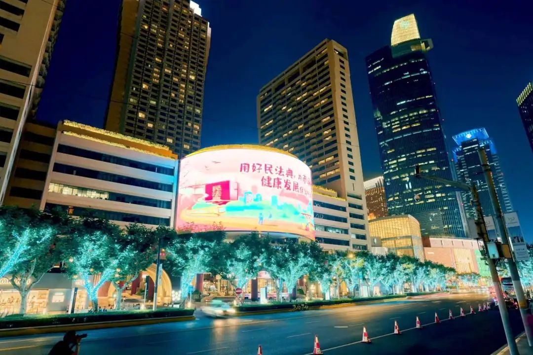 当百乐门的经典建筑美学与法治光影交织,与隔路相望的静安古寺形成“历史与法治的时空对话”;当上海商城的超大弧形屏幕成为法治叙事的“巨幕影院”,让每个驻足者都成为法治进程的“观影人”;当汇银大厦通透的玻璃幕墙于流光溢彩中演绎法典魅力,与楼宇内的办公灯光交相辉映。