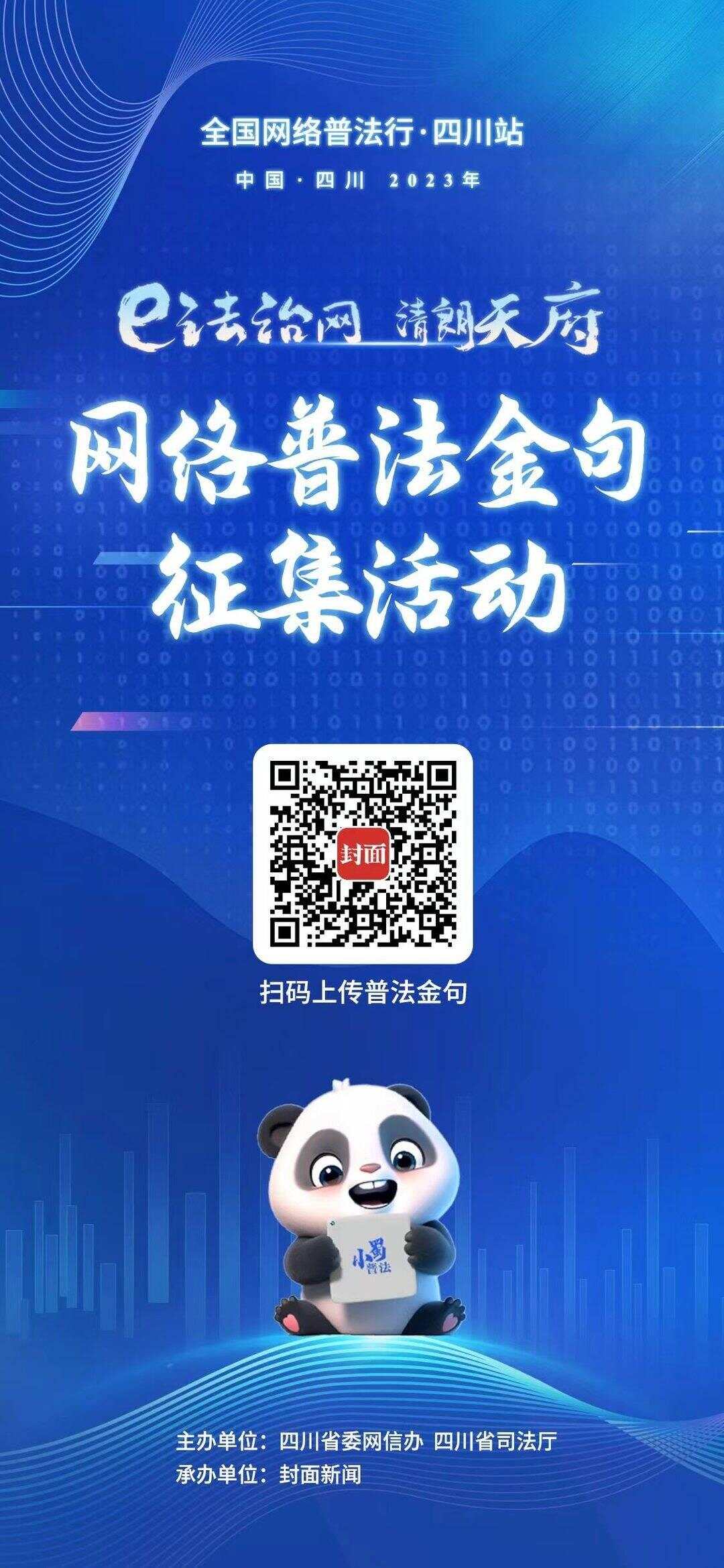 e法治网,清朗天府。快来点击链接参加活动,施展你的才华!即日起,由四川省委网信办、四川省司法厅主办,封面新闻承办的“网络普法金句征集活动”正式上线。