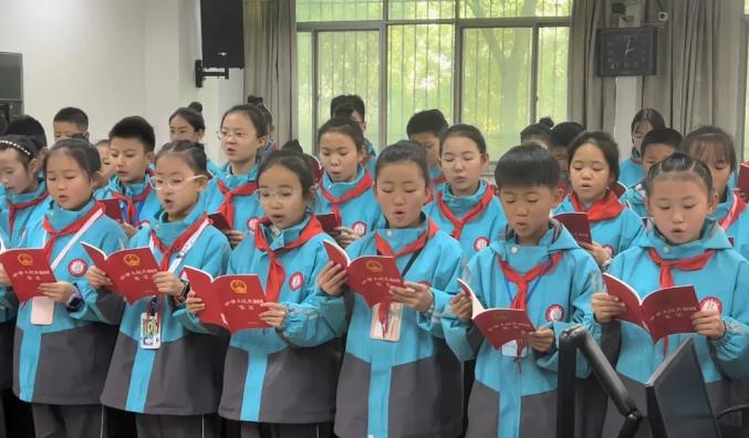 12月2日,陕西省宝鸡市金台区人民法院举办“学习宪法、维护宪法,争做新时代守法好公民”法院开放日活动,邀请宝平路小学50余名师生和家长代表走进法院,近距离感受法律的威严和庄重。图为学生们诵读宪法条文。