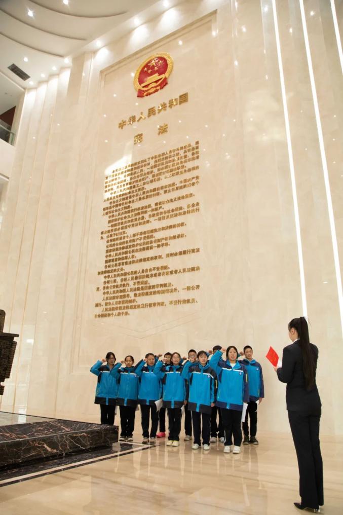 12月2日下午,兰州铁路运输中级法院组织开展法院开放日活动,邀请兰州市第二十中学部分师生走进法院。在法院干警的引导下,学生们参观了兰铁中院宪法墙,并在法官带领下诵读了部分宪法内容,学习宪法知识。图为法官带领学生宣誓。