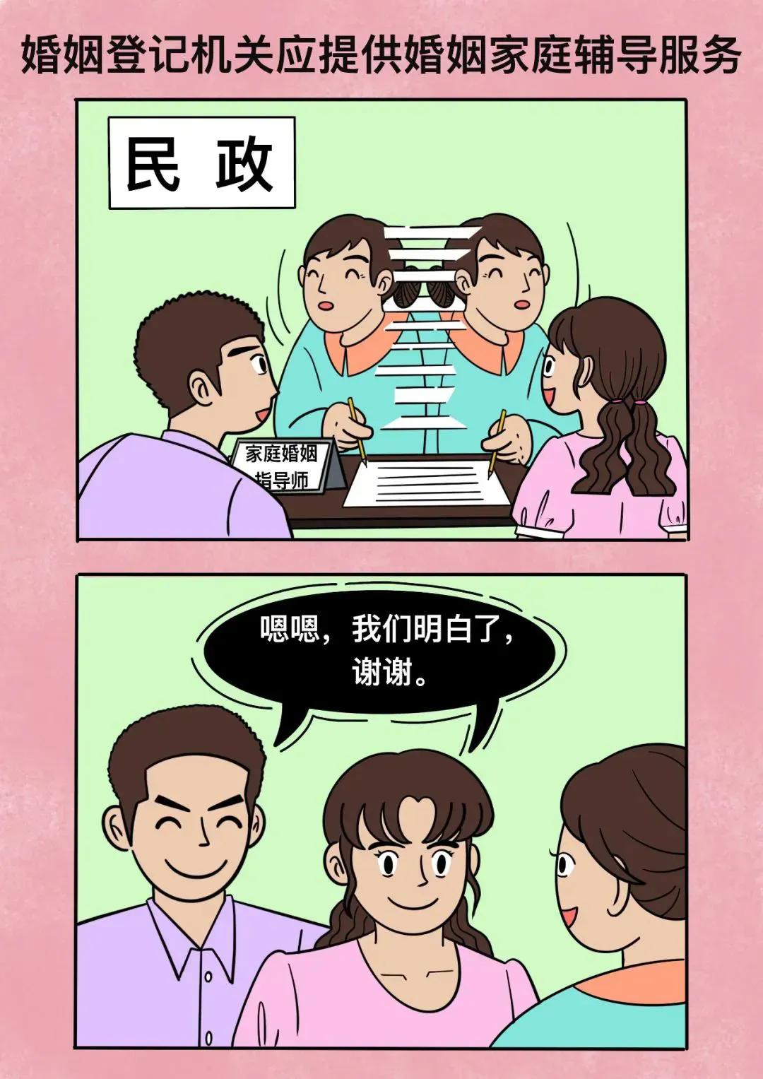 第六十三条 婚姻登记机关应当提供婚姻家庭辅导服务,引导当事人建立平等、和睦、文明的婚姻家庭关系。