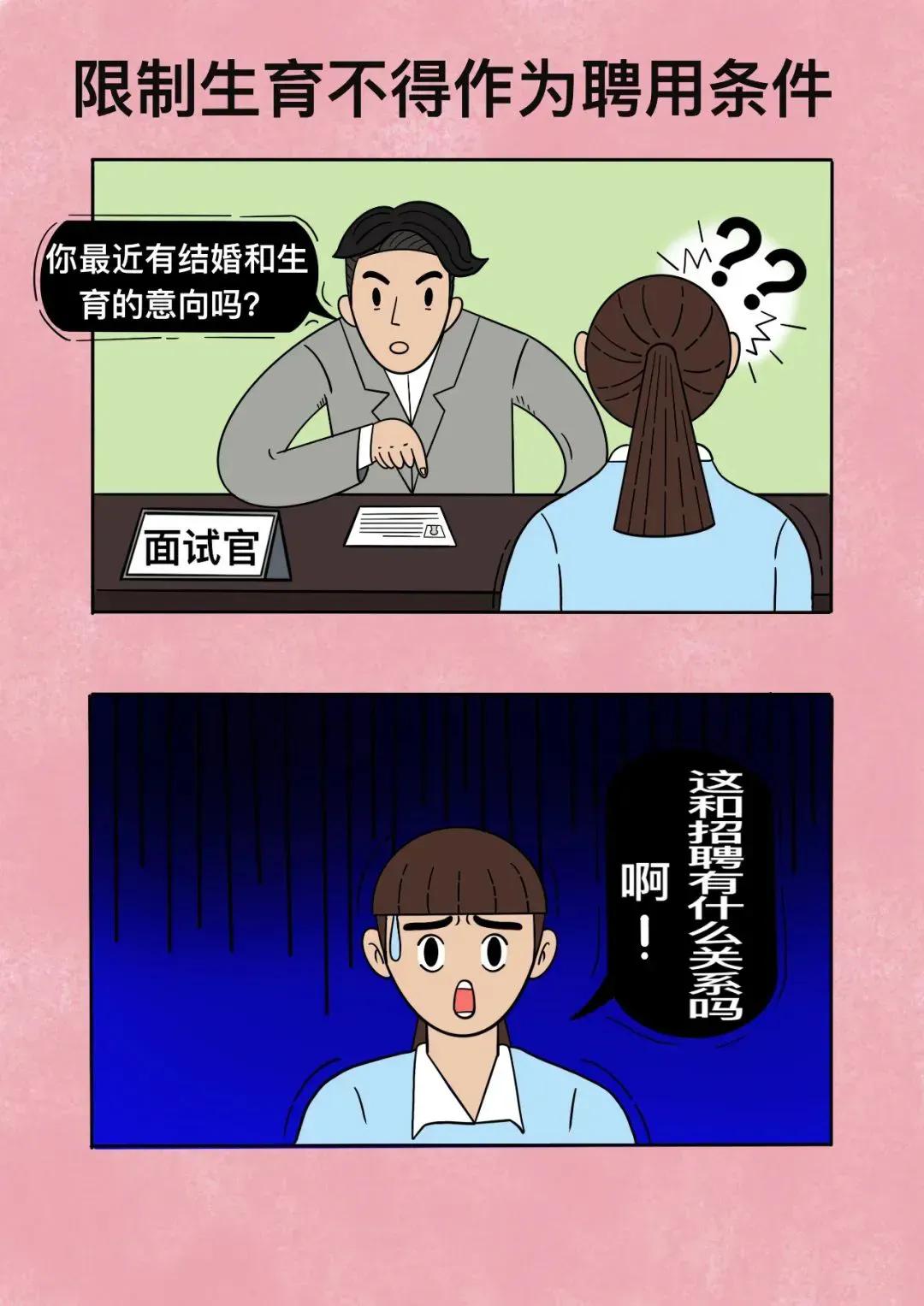 第四十三条 用人单位在招录(聘)过程中,除国家另有规定外,不得实施下列行为:限定为男性或者规定男性优先;除个人基本信息外,进一步询问或者调查女性求职者的婚育情况;将妊娠测试作为入职体检项目;将限制结婚、生育或者婚姻、生育状况作为录(聘)用条件;其他以性别为由拒绝录(聘)用妇女或者差别化地提高对妇女录(聘)用标准的行为。