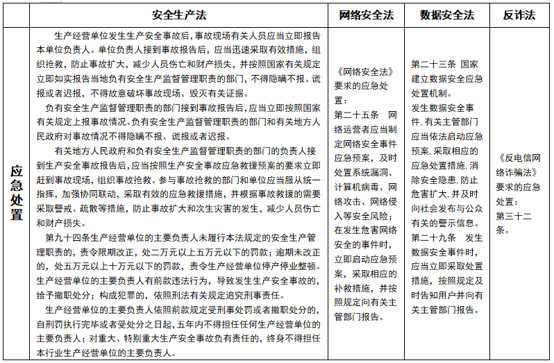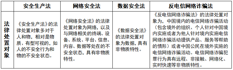 1、《安全生产法》和《网络安全法》、《数据安全法》、《反电信网络诈骗法》在法律处置对象比较表(表二):