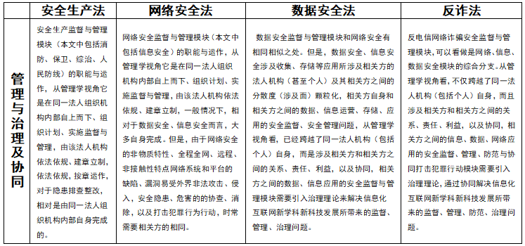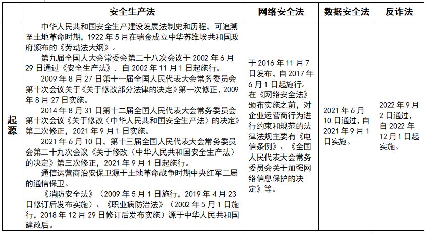 1、《安全生产法》和《网络安全法》、《数据安全法》、《反电信网络诈骗法》在起源上比较表(表一):