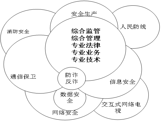 网络安全、信息安全、数据安全和治安保卫、企业内保与综治对涉及国家、企业、公民的人和物与非物质的安全业务技术管理,以及涉及公安、国安、检察、监管机关的国家安全、社会安全、公民个人与信息安全、涉及刑事案件的协查处置,也有一定的重叠度。
