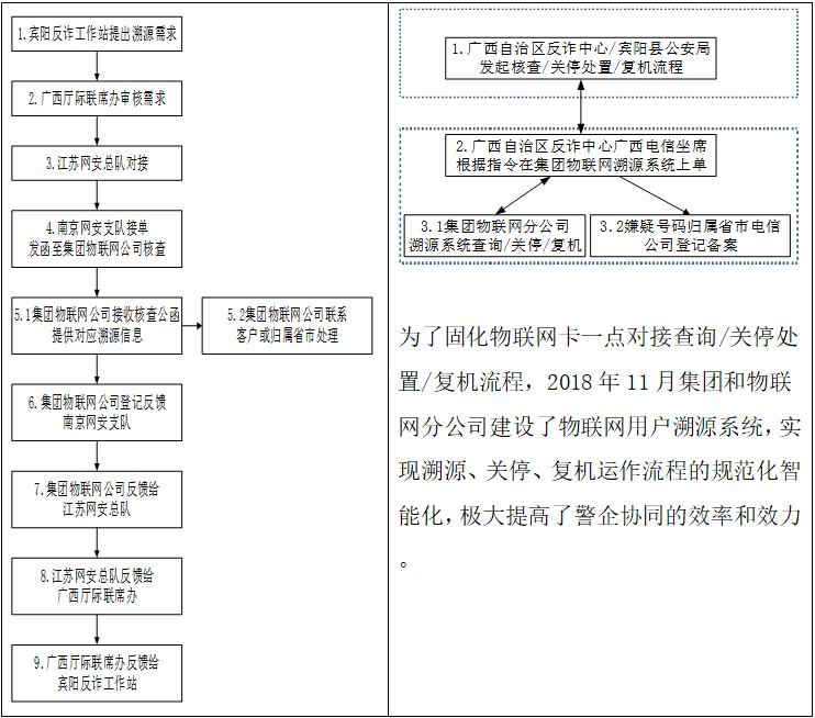 公安侧和电信侧革新了公安部和集团的规章和流程,2018年7月,电信接到宾阳公安局反馈关于全国电信物联网卡漫入宾阳被网络犯罪分子利用涉诈情况后,主动预警上报集团。在集团支持下,会同省内外警企相关方建立对全国电信物联网卡漫入宾阳的管控机制,创建省反诈中心电信座席1点对接协查的处置流程;革新原来需公司内外部9个跨省跨行业环节,至少需要至少5个工作日以上,缩短到宾阳公安--广西电信2个环节,时间缩短到1个小时以内(如图六所示)。