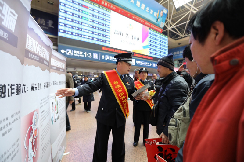 当日,北京铁路公安处刑警支队与北京西站派出所联合在西站开展“防范电信网络诈骗,伴您平安出行”宣传活动。