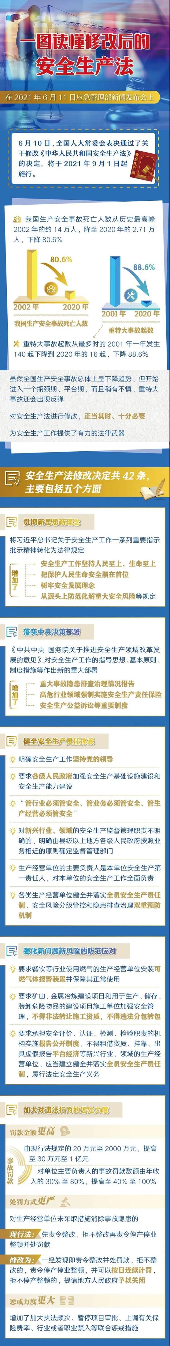 2021年6月10日,中华人民共和国第十三届全国人民代表大会常务委员会第二十九次会议通过《全国人民代表大会常务委员会关于修改<中华人民共和国安全生产法>的决定》。新《安全生产法》将于2021年9月1日起施行!