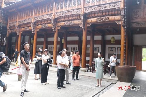 在讲解员的带领下,大家从码头换乘观光车,前往景区重点打造的匠心谷。“闲居偶种半篱月,插柳却得满庭芳”,观光车穿过密林小径,石碑、茶室、酒坊等建筑逐渐出现在大家眼前,紧接着,视野突然变得开阔,在稻田荷塘掩映之中隐隐能看见白墙黛瓦。阡陌交通、鸡犬相闻,怡然自乐的美好景象跃然在目,大家纷纷感叹,《桃花源记》中的场景在这一刻具现化了。