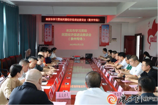 6月11日,自治区司法厅联合来宾市司法局、广西实体经济服务员工作队驻来宾市工作队在象州县开展“典亮企业·护航发展”暨民营经济促进法宣传活动,通过政企面对面座谈、专题法律讲座、普法资料赠阅等形式,为当地民营企业送上精准法治服务。