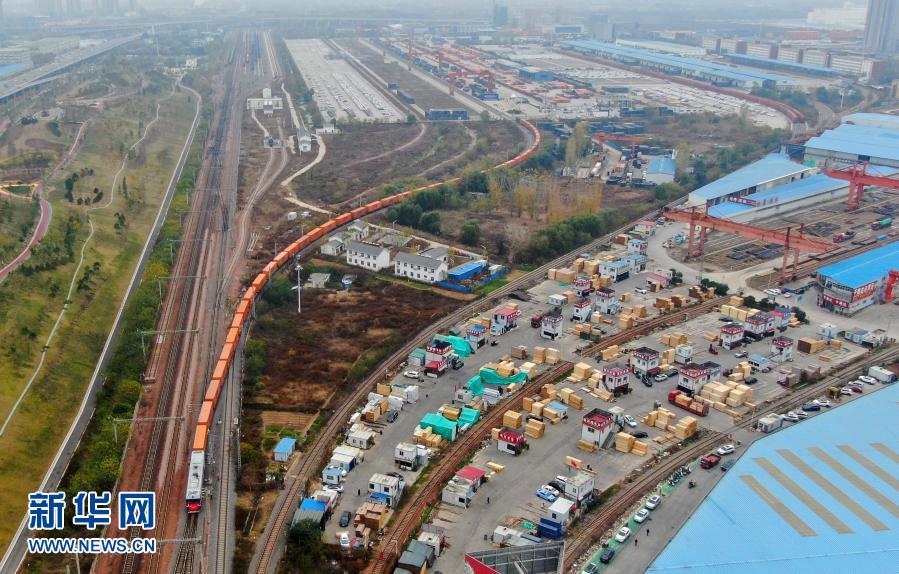 这是11月20日,中欧班列(中国郑州至芬兰赫尔辛基)驶出中国铁路郑州局集团有限公司圃田车站(无人机照片)。新华社记者 郝源 摄