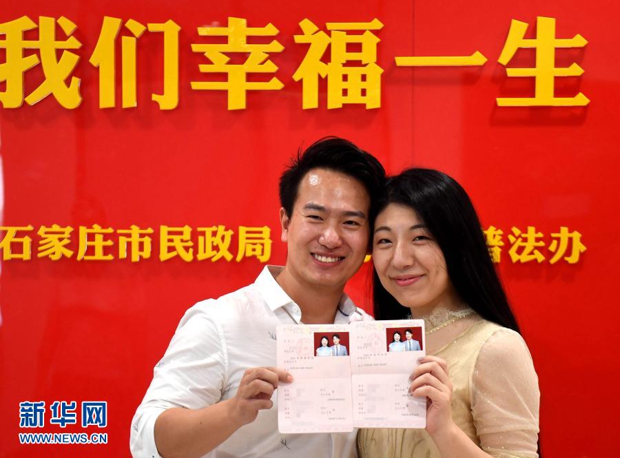 这是8月25日,在河北省石家庄市桥西区民政局婚姻登记处,一对新人领取结婚证后拍照留念。新华社记者 王晓 摄