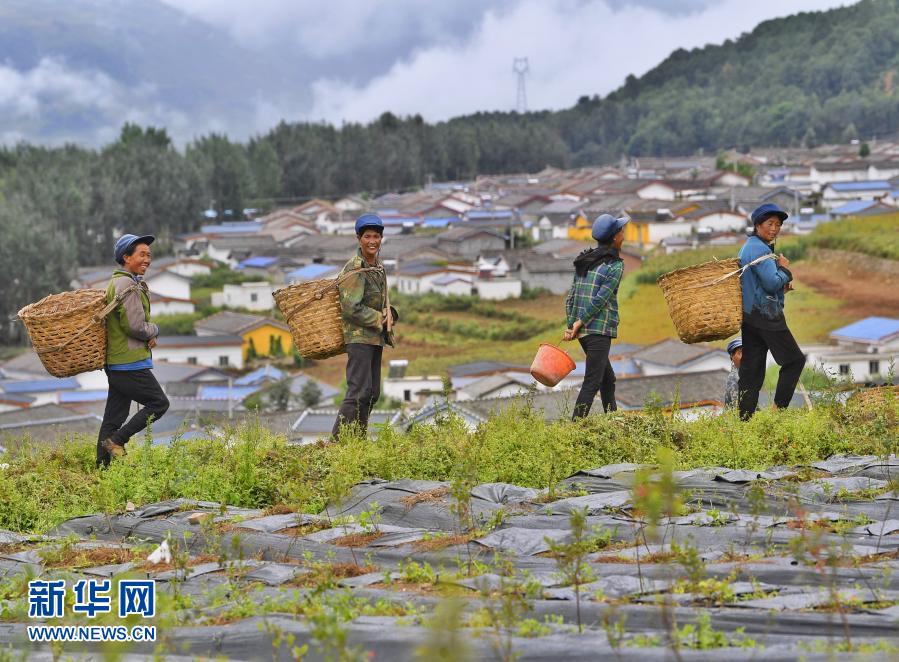 这是8月13日,四川省凉山彝族自治州布拖县拖觉镇老吉村的妇女在去往蓝莓种植基地务工的路上。新华社记者 刘坤 摄