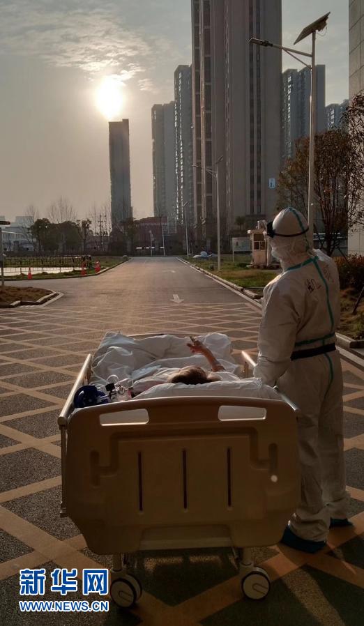 这是3月5日,在武汉大学人民医院东院,复旦大学附属中山医院支援湖北医疗队的刘凯在护送患者做CT的途中停下,让住院近一个月的87岁老人欣赏久违的日落。新华社发(甘俊超 摄)