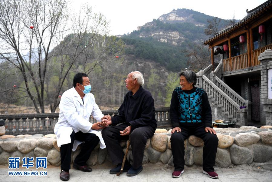 这是4月15日,在河北省阜平县龙泉关镇骆驼湾村,村医霍建国为村民把脉。新华社记者 王晓 摄