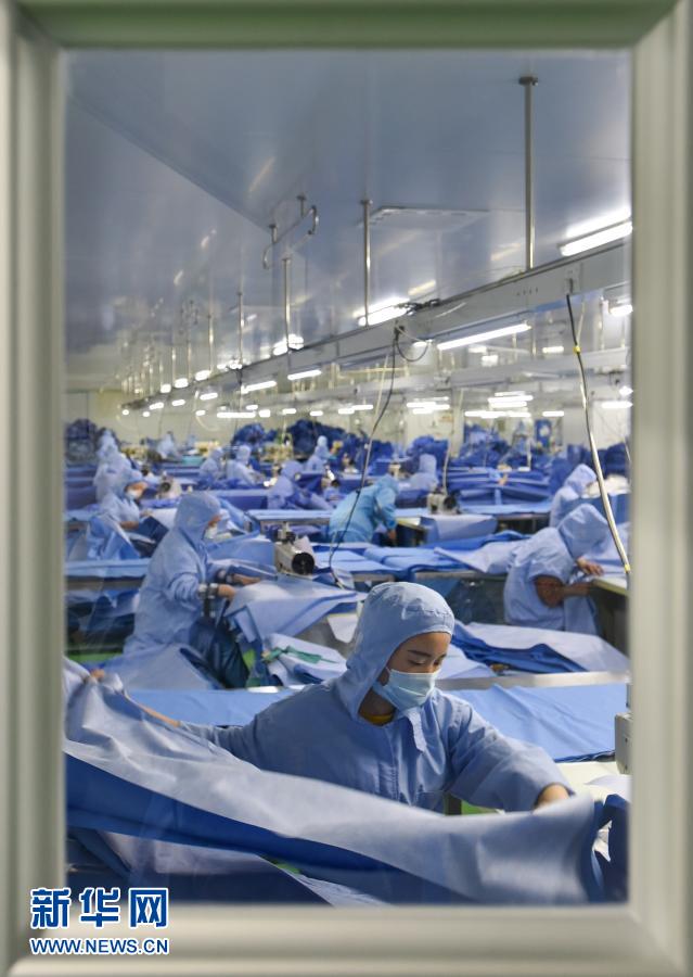 这是3月3日,广东佛山康得福公司员工在医用防护服生产线缝制产品。新华社记者 刘大伟 摄