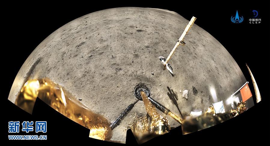 这是12月4日,国家航天局公布了探月工程嫦娥五号探测器在月球表面展示国旗的照片。嫦娥五号着陆器和上升器组合体全景相机环拍成像,五星红旗在月面成功展开,此外图像上方可见已完成表取采样的机械臂及采样器。新华社发(国家航天局供图)