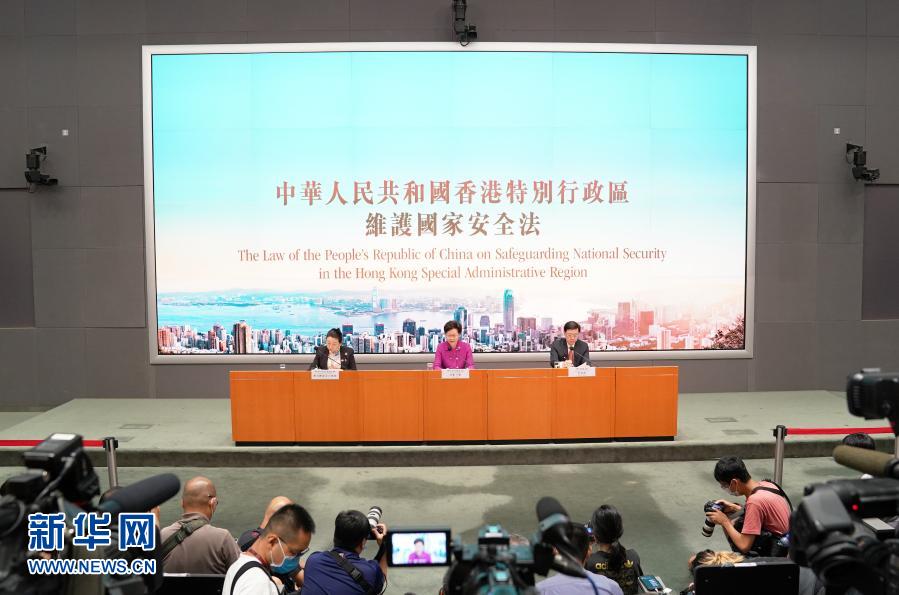 这是7月1日,在香港特区政府总部,香港特区行政长官林郑月娥、律政司司长郑若骅、保安局局长李家超出席新闻发布会。新华社记者 李钢 摄