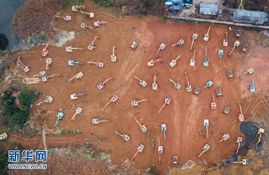 这是1月24日,大型机械在武汉火神山医院建设工地施工(无人机照片)。新华社记者 肖艺九 摄
