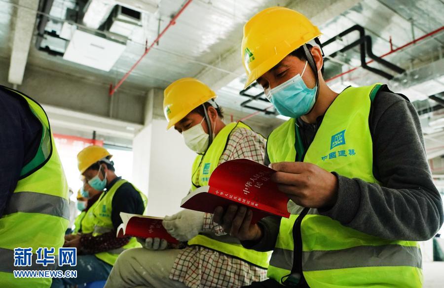 这是11月27日,在中建二局上海大悦城二期项目工地举行的普法宣讲活动上,建筑工人翻阅民法典。新华社记者 方喆 摄