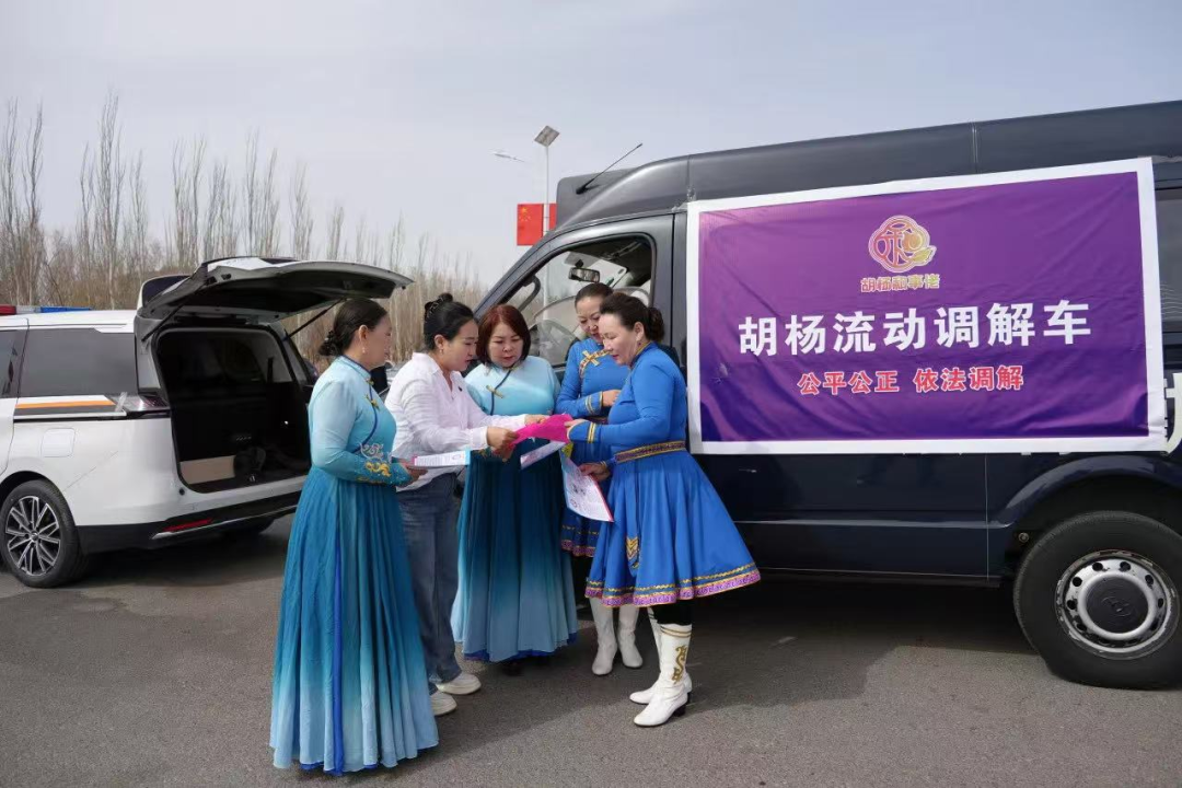 创新打造“胡杨流动调解车”,组建“移动法治智囊团”,调解员随车深入基层,为居民提供“家门口”的法律咨询与纠纷调解服务。调解车运行以来,针对婚姻家庭矛盾、物业纠纷、民间借贷等问题提供咨询100余人次,工作人员以通俗亲和的沟通方式答疑解惑,将调解车打造成普法宣传前沿阵地,有效解决群众“急难愁盼”,实现法治宣传与基层治理的深度融合。