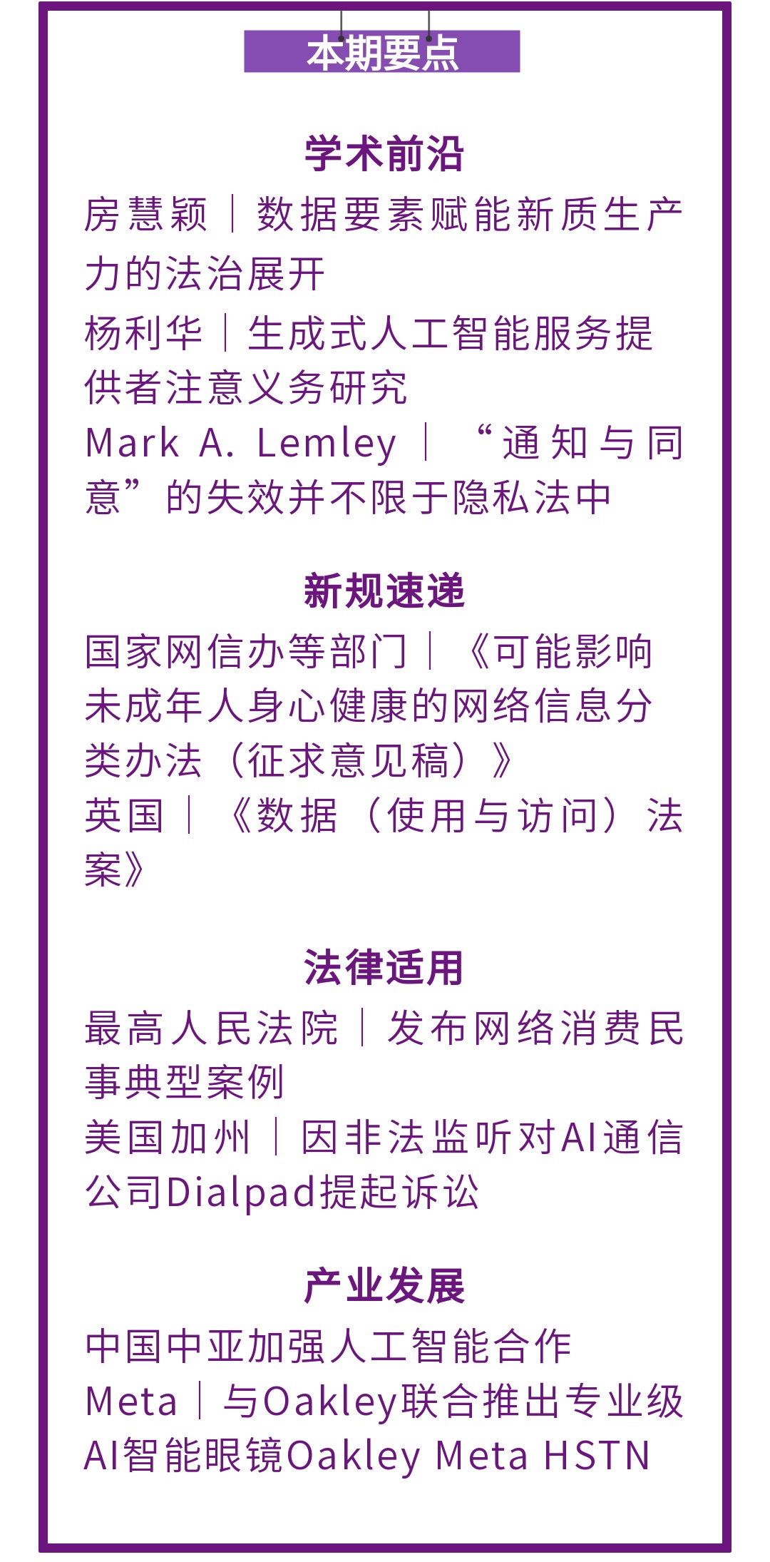 郑曦|数字时代刑事诉讼中人的主体地位在刑事诉讼中确立人的主体地位具有重要意义。判断何者为刑事诉讼主体,需遵循特定标准。在数字时代,新型工具的运用对人在刑事诉讼中的主体地位构成了威胁,尤其是刑事诉讼中运用的智能化工具已经初步形成“类主体”的地位,冲击了办案人员和当事人的刑事诉讼主体地位,导致人的尊严受到贬损。在此种情形下,基于明确工具服务于人的目的、兼顾“目的合理性”和“价值合理性”、警惕技术逻辑之必要,应重新强调数字时代刑事诉讼中人的主体地位,并从规则层面保障人的主体地位。首先,应明确工具在刑事诉讼中的辅助性地位;其次,应充分保障当事人在刑事诉讼中的参与权;最后,应落实司法责任制的要求,保证办案人员在办理刑事案件时权责统一,从而保障人的主体地位。(全文刊《法制与社会发展》2025年第2期)郑曦,北京外国语大学法学院教授。新规速递中国网络文明大会|《向未成年人提供生成式人工智能服务安全指引》2025年6月10日,中国网络文明大会人工智能分论坛发布《向未成年人提供生成式人工智能服务安全指引》。《指引》由中国网络空间安全协会联合60家单位编写,依据《网络安全法》《未成年人保护法》等法律法规,提出生成式人工智能服务全生命周期的安全管理要求,强调“主体责任+社会共治”模式,鼓励企业与科研机构合作研发适龄化产品,推动人工智能素养教育。附录部分提供生成内容、数据安全等操作指南。(中国网络文明大会)