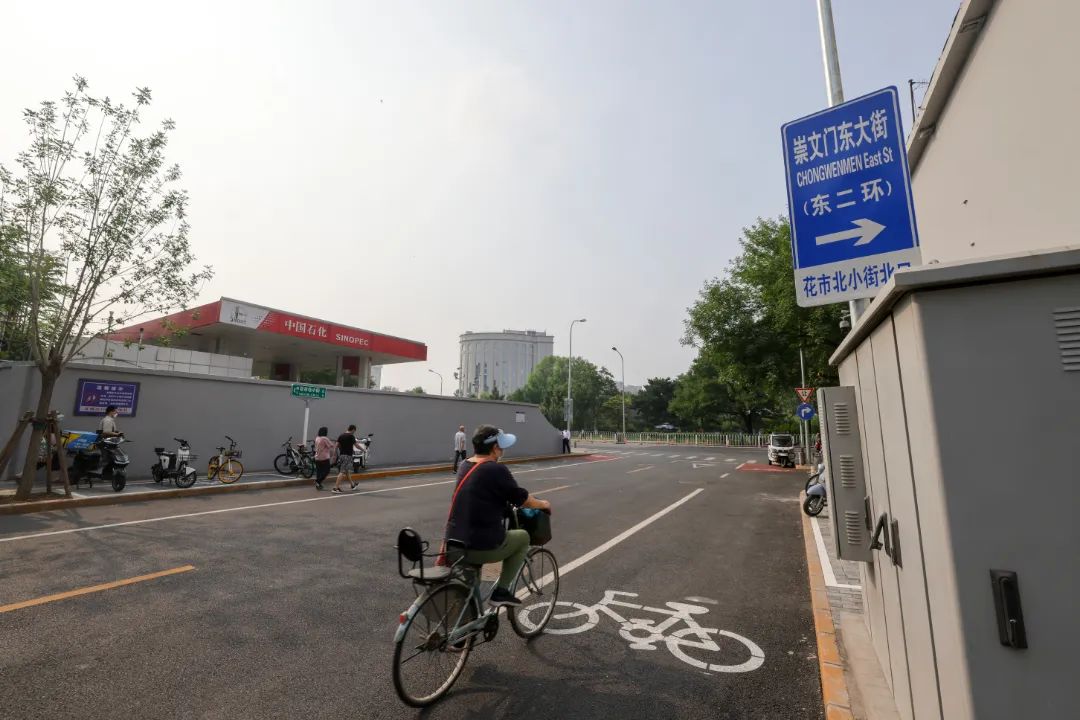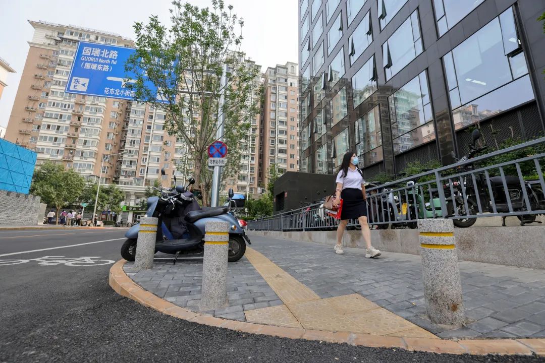 花市北小街位于哈德门写字楼东侧,这条道路原本不通车,也没有名字。水泥铺装的路面没有设置便道,两侧停了很多车。记者在现场看到,改造后的道路铺上了柏油,可以双向通行机动车,2.5米宽的非机动车路面穿上了彩色“外衣”,既美观又防滑。两侧的便道设置了非机动车停车区域,盲道的端头设计了缘石坡道,方便残障人士通行。目前该道路已经通车,并有了属于自己的名字,国瑞城的居民可以更加方便地步行到达崇文门东大街。