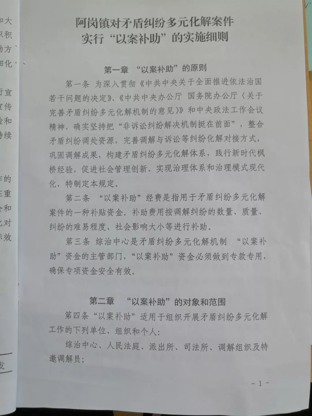 ●同时,为解决调解工作中的经费困难,我们出台了《阿岗镇对矛盾纠纷多元化解案件实行‘以案补助’的实施细则》,根据难易程度,对已成功化解的矛盾纠纷,给予调解员200至400元不等的补助,调动社会力量参与矛盾调解工作的热情。在下一步的工作中,我们将进一步整合资源,完善调解、诉讼等纠纷化解方式,实现人民调解、行政调解、司法调解的有机衔接与优势互补,满足人民群众多元的纠纷解决需求,有效化解各类纠纷,维护社会和谐,提升社会治理体系和治理能力现代化。